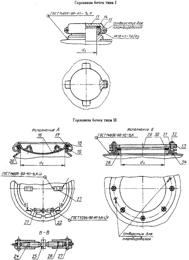 - для бочек типа I - бочка, колпак, пробка воздушной горловины с кольцом и цепочкой, прокладки;