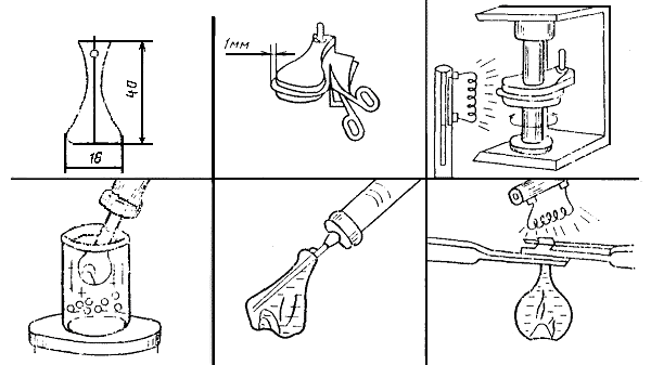 3.6.1. Для изготовления ампул в соответствии с чертежом используют шаблон, состоящий из двух металлических деталей грушевидной или другой формы, скрепляемых в верхней части винтом, позволяющим свободное вращение и закрепление обеих половин. Два кусочка чистой пленки, предварительно протертых спиртом и высушенных, помещают между деталями шаблона, зажимают и аккуратно обрезают ножницами так, чтобы края пленки выступали снаружи примерно на 1 мм.