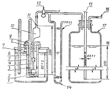 1 - охлаждающая баня; 2 - изоляционное кольцо; 3 - прокладка; 4 - фильтр; 5 - измерительный сосуд; 6 - прокладка; 7 - кожух; 8 - поддерживающее кольцо; 9 - пробка; 10 - пипетка; 11 - калибровочная метка (20 см3); 12 - трехходовый закупорный кран; 13 - U-образный манометр; 14 - вода; 15 - соединение с атмосферой; 16 - соединение с вакуумным насосом; 17 - стеклянная бутыль (буферная емкость); 18 - уровень воды