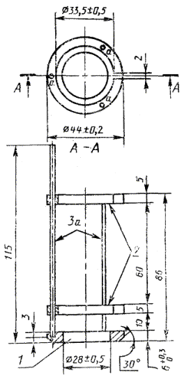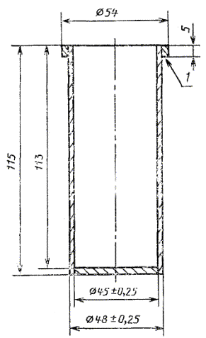 6.2. Металлический кожух (черт. 2) - латунный, цилиндрический, водонепроницаемый, плоскодонный внутренним диаметром (45 ± 0,25) мм, наружным диаметром (48 ± 0,25) мм и высотой 115 мм. Используют в качестве водяной бани.