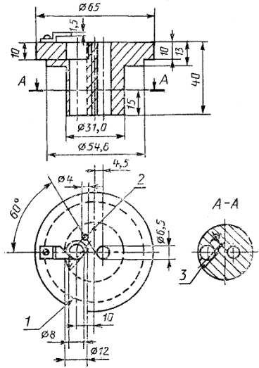 6.6. Пробка (черт. 5) из маслостойкого материала, подогнанная к измерительному сосуду и поддерживающему кольцу. Пробка должна иметь три отверстия: для пипетки (п. 6.7), термометра (п. 6.8) и выхода в атмосферу. Если используют термометр с более широкими пределами температур, верхняя часть пробки может иметь вырезанную щель, которая дает возможность отсчета температуры по термометру (6.8) до минус 30 °С. К верхней поверхности пробки должен быть прикреплен указатель для соответствующего помещения термометра по отношению ко дну измерительного сосуда. Для поддерживания термометра в правильном положении надо использовать зажим из пружинной проволоки,