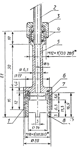 ж - обозначение резьбы по ГОСТ 9150-81 1/ - накатка; 2 - трубка пипетки; 3 - латунная гайка; 4 - прокладка из маслостойкой пластмассы, кольцевые, диаметром 5,28×1,78; 5 - латунный корпус; 6 - прокладка из маслостойкой пластмассы, кольцевая, диаметром 12,42×1,78; 7 - оправка фильтрующей сетки; 8 - латунный цилиндр с наружной резьбой