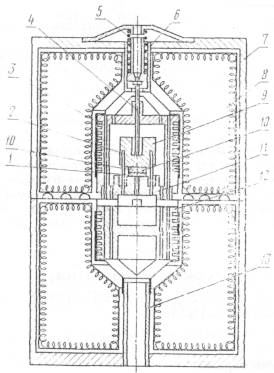 1 - тепломер; 2 - термопара; 3 - адиабатная оболочка; 4 - прижим; 5 - пружина; 6 - входной патрубок; 7 - корпус; 8 - теплозащитная оболочка; 9 - стержень; 10 - образец; 11 - основание; 12 - нагревательный блок; 13 - выходной патрубок
