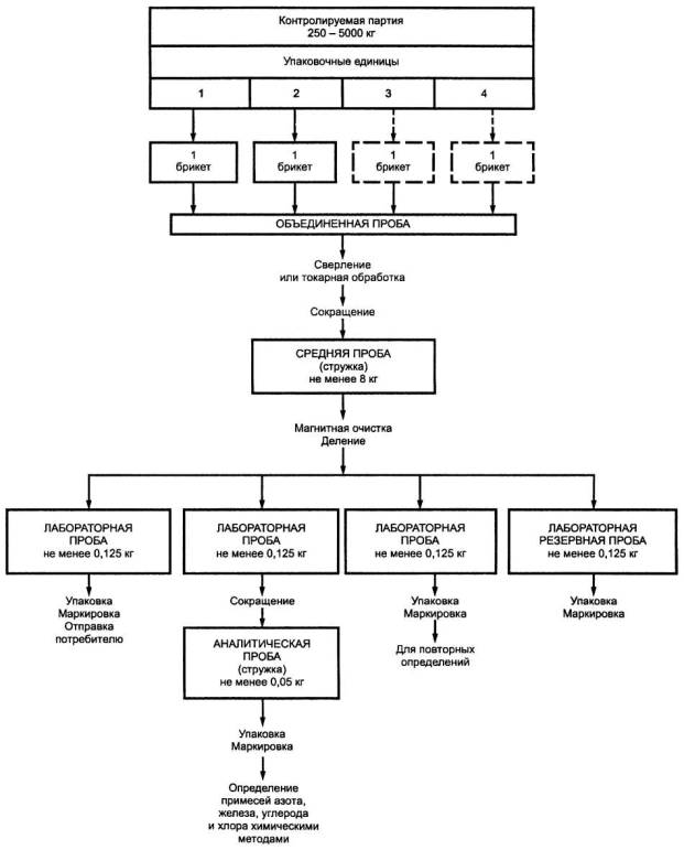 Схема отбора и подготовки проб от партий губчатого титана в брикетах приведена в приложении Б.