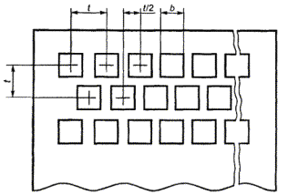 А.1 Контрольные листовые сита должны изготовляться с квадратными или круглыми отверстиями, расположенными в шахматном порядке (см. рисунок А.1).