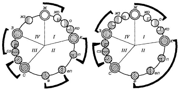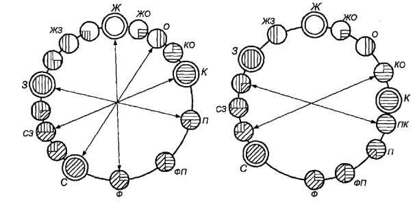 Ж - желтый; ЖО - желто-оранжевый; О - оранжевый; КО - красно-оранжевый; К - красный; П - пурпурный; ФП - фиолетово-пурпурный; Ф - фиолетовый; С - синий; СЗ - сине-зеленый; З - зеленый; ЖЗ - желто-зеленый; I, II, Ш, IV - цветовые зоны