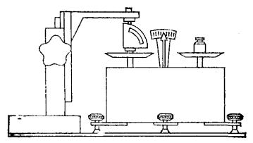 Пружину дюрометра (п. 4.4) калибруют, установив дюрометр в вертикальном положении и опустив кончик индентора (п. 4.2) на небольшую опору в центре одной из чашек весов (черт. 3), во избежание взаимодействия прижимной поверхности дюрометра (п. 4.1) и чашки весов. Опора на чашке имеет небольшой цилиндрический выступ высотой около 2,5 мм, диаметром около 1,25 мм