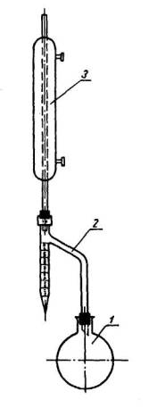 Узкогорлую колбу 1 (см. чертеж 1) соединяют непосредственно при помощи шлифа, а широкогорлую при помощи перехода и шлифов с отводной трубкой чистого и сухого приемника-ловушки 2. К приемнику-ловушке присоединяют при помощи шлифа прочищенный ватой холодильник 3.