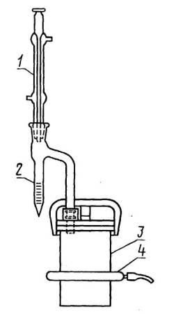 1 - холодильник водный; 2 - приемник-ловушка; 3 - сосуд дистилляционный; 4 - горелка газовая