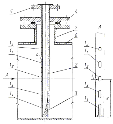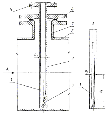 «2.13.1.17. Пробозаборное устройство щелевого типа состоит из стабилизатора (черт. 20) и пробозаборной трубки. Конструкция устройства с одним отверстием приведена на черт. 15а, с пятью отверстиями - на черт. 15б. Параметры стабилизатора рассчитывают согласно алгоритму (приложение 4)».