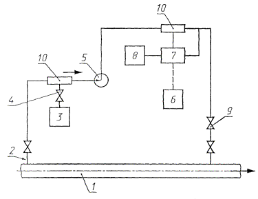1 - трубопровод; 2 - пробозаборное устройство; 3, 8 - пробозаборники; 4 - кран для ручного отбора проб; 5 - насос; 6 - регуляторы; 7 - запорное устройство; 9 - обратный клапан; 10 - диспергаторы
