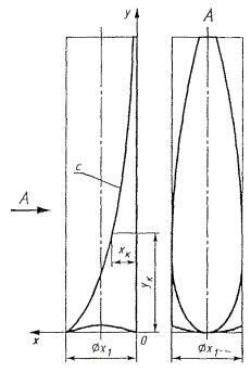 Поверхность С стабилизатора (черт. 20) выполняется по точкам, проекция которых на плоскость Оху является параболой второй степени с параметрами хк и ук (k = 1, . . . , 11), мм, определяемыми по формулам: