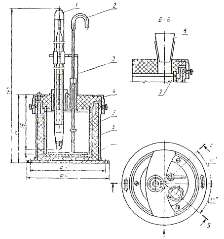 1 - термометр с муфтами; 2 - ручка мешалки; 3 - ручка крышки; 4 - крышка; 5 - термоизоляционный стакан; 6 - стакан влагомера; 7 - корпус; 8 - пробка; 9 - уплотнительное кольцо