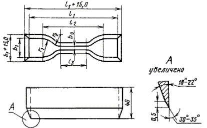1.9. Для лучшего закрепления образцов в захватах применяют образцы с наплывами. Форма и размеры пластин для вырубки таких образцов даны в приложении 1. Наплывы должны быть расположены симметрично относительно центра образца.