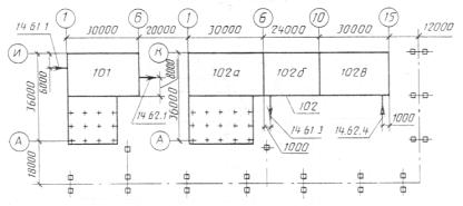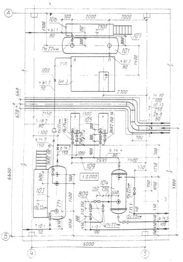 вводы и выводы основных трубопроводов с обозначением трубопроводов и с привязкой их к координационным осям зданий (сооружений). Допускается для групповых вводов и выводов привязку выполнять только к осям крайних трубопроводов или осям подводящих эстакад.