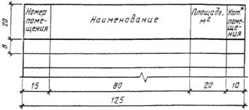Площади проставляют в нижнем правом углу помещения (технологического участка) и подчеркивают. Категории помещений (технологических участков) проставляют под их наименованием в прямоугольнике размером 5´8 (h) мм.