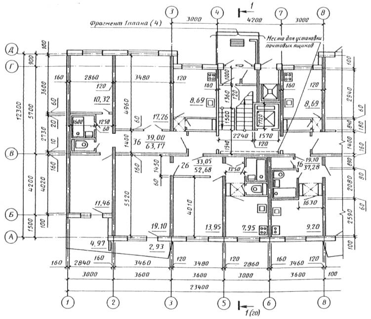 Для жилых зданий, при необходимости, на планах указывают тип и площадь квартир. При этом площадь проставляют в виде дроби, в числителе которой указывают жилую площадь, в знаменателе - полезную.