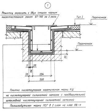 Облицовка кислотоупорной керамической плиткой марки КШ толщиной 20 мм на андезитовой замазке с разделкой швов замазкой арзамит-5 |