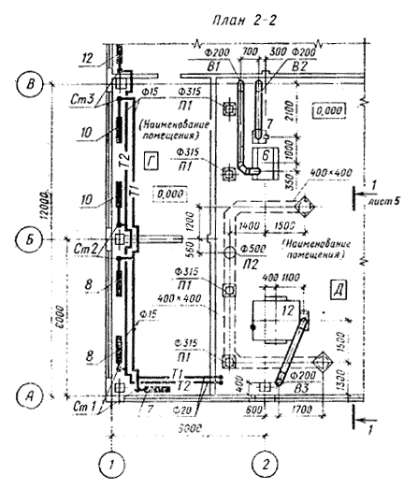 Примеры оформления планов и разрезов установок систем показаны на черт. 18 и 19.
