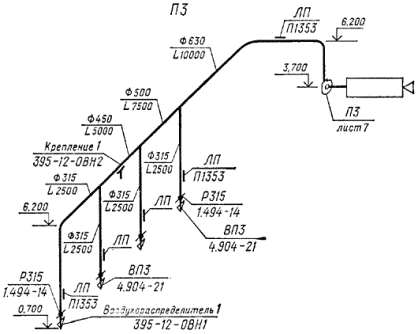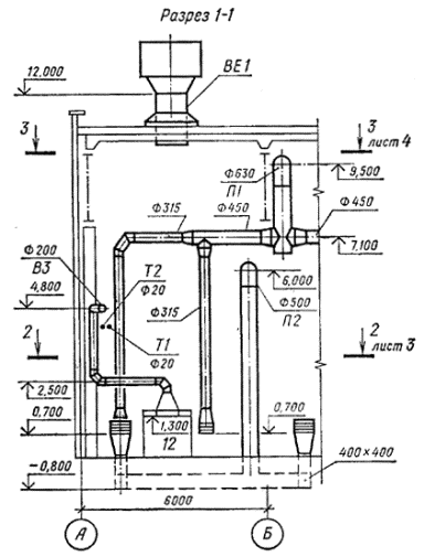воздуховоды, их диаметры (сечения) и количество проходящего воздуха в м3/ч (черт. 14);