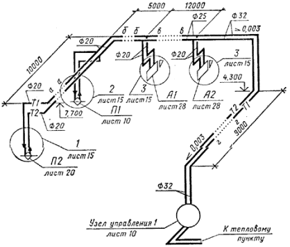 Примеры оформления схем систем отопления и теплоснабжения установок показаны на черт. 10 и 11.
