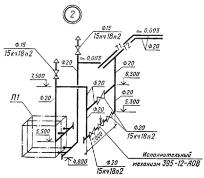 4.1. Планы и разрезы установок систем выполняют в масштабе 1:50 или 1:100, узлы установок - в масштабе 1:20, при детальном изображении узлов - в масштабе 1:2, 1:5 или 1:10.