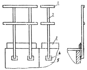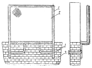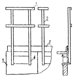 1 - заполнение; 2 - стойка; 3 - бортовая доска; 4 - место крепления (к стене или за оконный проем); 5 - стена здания