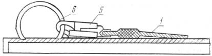 1 - стальной канат; 2 - детали крепления стального каната с натяжным устройством; 3 - конструктивный элемент здания, к которому закрепляют канат в процессе эксплуатации; 4 - подкладка под острые углы в местах огибания стальным канатом конструктивных элементов; 5 - карабин; 6 - монтажная петля в сборных железобетонных элементах конструкций или специальное устройство для закрепления каната