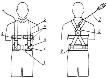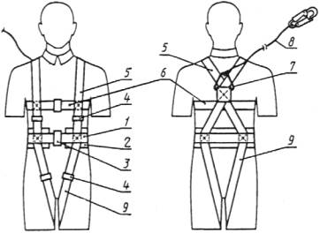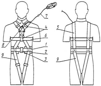 - подкладка лямки; 7 - пряжка лямки; 8 - карабин; 9 - строп;