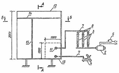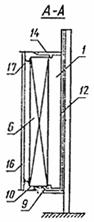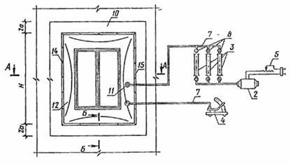 1 - камера; 2 - воздушный насос; 3 - измеритель расхода воздуха; 4 - микроманометр; 5 - регулятор расхода воздуха; 6 - образец (окна, стены, перегородки); 7 - резиновые шланги; 8 - воздушные запорные краны; 9 - плоская пористая резина; 10 - мастика; 11 - штуцер; 12 - днище; 13 - горизонтальная и вертикальная неподвижные стенки; 14 - горизонтальная подвижная стенка; 15 - вертикальная складывающаяся стенка; 16 - опорные штанги; 17 - передвижные домкраты