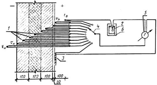 4.5. Первичные преобразователи температур и тепловых потоков располагают в соответствии со схемой. Пример схемы размещения термопар по сечению и на поверхности ограждающей конструкции и подключения их к измерительной аппаратуре приведен в приложении 2.