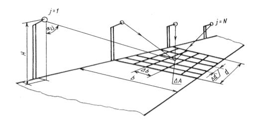 4.5. Перед измерением средней яркости дорожного покрытия косвенным методом посредством измерения освещенности на контрольном участке наносят элементарные площадки DA. Количество элементарных площадок n рассчитывают по формуле
