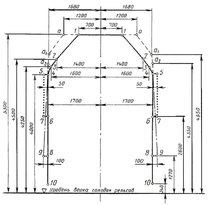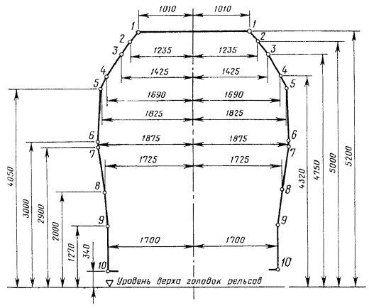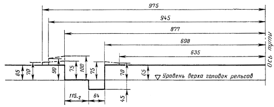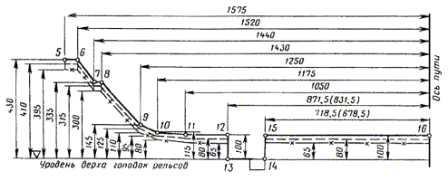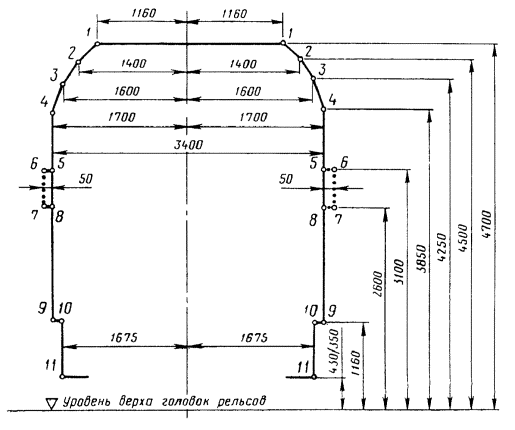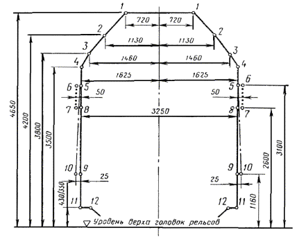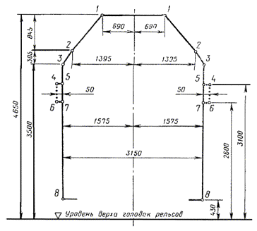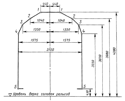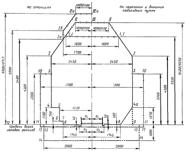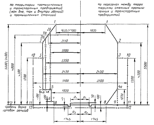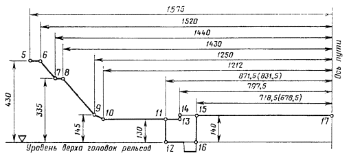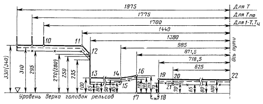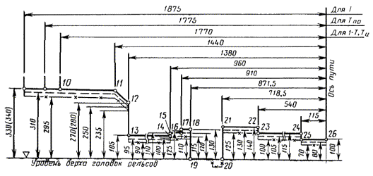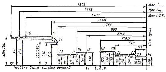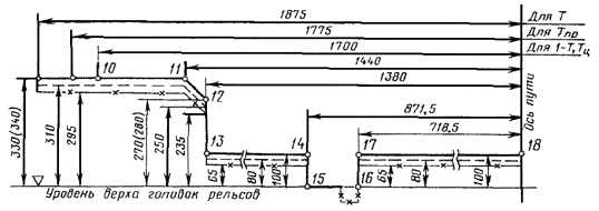 2. Размеры от оси пути до точек 1, и от уровня верха головок рельсов до линии 1-1 указаны для неэлектрифицируемых путей, при этом в скобках приведены размеры, допускаемые внутри зданий.