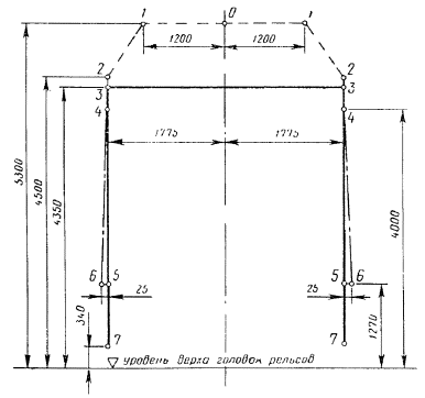 Размеры, показанные в виде дроби, означают: в числителе - для контактной подвески с несущим тросам, в знаменателе - без несущего троса;