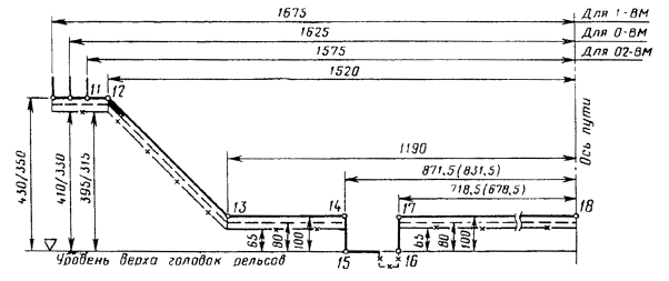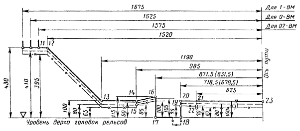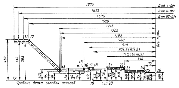 1-ВМ (0-Т) - для подвижного состава, допускаемого к обращению как по всей сети железных дорог Союза ССР колеи 1520 (1524) мм, так и по магистральным и ряду других линий железных дорог - членов Организации сотрудничества железных дорог (ОСЖД) колеи 1435 мм, используемых для международных сообщений (черт. 12, 15);