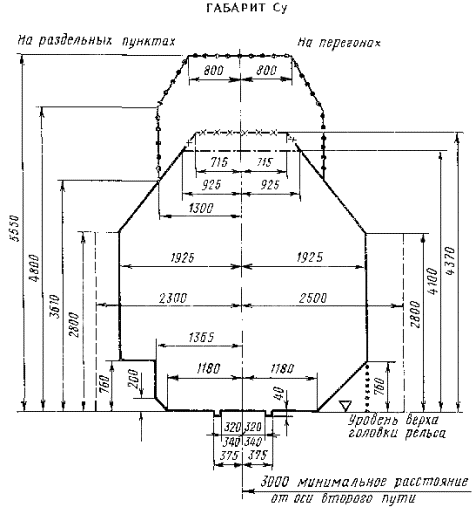 габарит приближения строений Су (черт. 1) - предельное поперечное (перпендикулярное оси пути) очертание, внутрь которого помимо подвижного состава не должны заходить никакие части сооружений и устройств, а также лежащие около пути материалы, запасные части и оборудование, за исключением частей устройств (подвагонных толкателей в рабочем состоянии, контактных проводов с деталями крепления, хоботов гидравлических колонок при наборе воды и др.), предназначенных для непосредственного взаимодействия с соответствующими частями подвижного состава, при условии, что указанные устройства во внутригабаритном пространстве не будут соприкасаться с другими элементами подвижного состава;