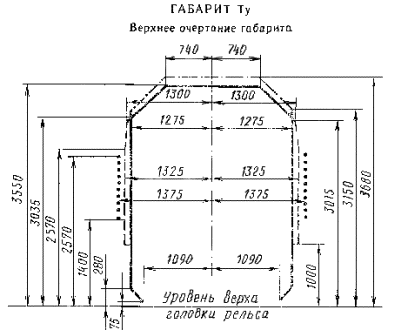 габарит подвижного состава Ту (черт. 2 и черт. 3) - предельное поперечное (перпендикулярное оси пути) очертание, в котором должен помещаться установленный на прямом горизонтальном пути как в порожнем, так и в нагруженном состоянии подвижной состав с учетом максимальных нормируемых допусков и износов, за исключением бокового наклонения на рессорах;