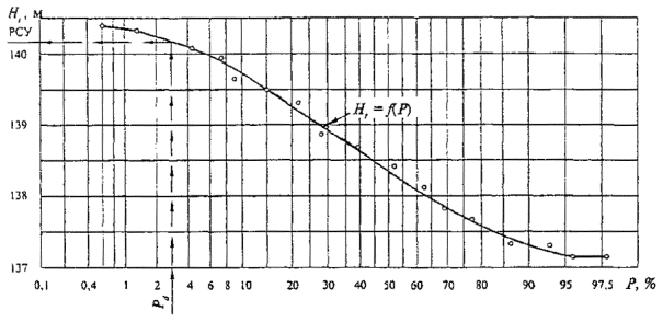 Б.1.5 На основе полученных знаний Ht и P строят график Ht=f(P), по которому определяют отметку РСУ в зависимости от расчетной вероятности превышения Рd, %, принимаемой равной: 2 - для водного пути 1-го класса, 3 - для 2-го класса, 4 - для 3 6 и 7-го классов, 5 - для 4-го и 5-го классов. Пример построения графика и определения по нему РСУ приведен на рисунке Б.1