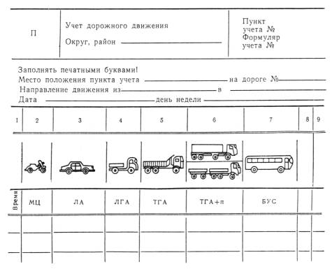 2.10. При проведении учета движения следует заполнять формуляры учета (черт. 2). Формуляр учета должен содержать данные о пункте учета (номер, положение, направление движения), сроках и продолжительности учета, а также о типах транспортных средств, подлежащих учету. Данные о количестве транспортных средств заносятся в формуляр с интервалом в 1 h и раздельно по направлениям движения.