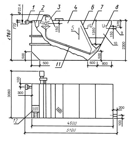 1 - входной патрубок; 2 - лоток; 3 - аэратор; 4 - аэрационная зона; 5 - успокоительная перегородка; 6 - разделительная перегородка; 7 - скобы для погружных досок; 8 - сборные лотки с водосливами; 9 - отводной патрубок; 10 - отстойная зона; 11 - система возврата ила; 12 - решетка или решетка-дробилка