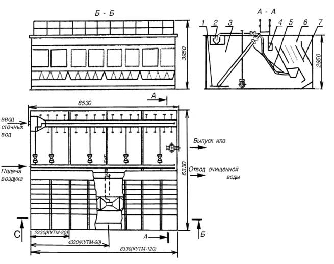 1 - аэрационная система; 2 - подающий лоток; 3 - аэротенк; 4 - сборный лоток; 5 - эрлифт; 6 - отстойник; 7 - блок тонкослойного модуля