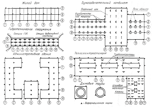 Конкретное расположение деформационных марок на зданиях и сооружениях, а также конструкции марок должна определять организация, выполняющая измерения, по согласованию с проектной, строительной или эксплуатирующей организацией, учитывая конструктивные особенности (форму, размеры, жесткость) фундамента здания или сооружения, статические и динамические нагрузки на отдельные их части, ожидаемую величину осадки и ее неравномерность, инженерно-геологические и гидрогеологические условия строительной площадки, особенности эксплуатации здания или сооружения, обеспечение наиболее благоприятных условий производства работ по измерению перемещений.