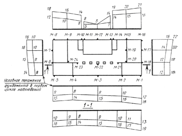 1.4. Наблюдения за деформациями оснований фундаментов следует производить в следующей последовательности: