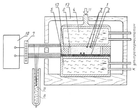 1 - образец грунта; 2 - тепломер; 3 - датчики температуры; 4 - верхняя термостатированная плита; 5 - нижняя термостатированная плита; 6 - обойма из органического стекла; 7 - переключатель; 8 - сосуд Дьюара; 9 - спай сравнения; 10 - потенциометр; 11 - прижимное устройство; 12 - теплоизоляционный кожух; 13 - поролон