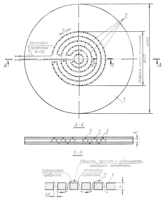 Тепломер представляет собой термобатарею, смонтированную на пластине из органического стекла диаметром 250 мм и толщиной 4 мм (см. чертеж). Термобатарея может быть изготовлена из отрезков хромелевых и копелевых проволок диаметром 0,2 мм, спаянных последовательно. Термобатарею размещают в средней части пластины диаметром 100 мм, имеющей 130 отверстий диаметром 0,6 мм на расстоянии 8 мм друг от друга. Спаи термобатареи располагают поочередно с одной и другой сторон пластины. К концам термобатареи приваривают (припаивают) две копелевые проволоки диаметром 0,5 мм. С обеих сторон тепломера клеем БФ-2 наклеивают слой лакоткани.