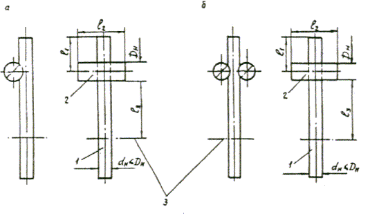 4.14. Образцы крестообразных соединений испытывают на разрывных машинах по схемам, указанным на черт. 2. По схеме черт. 2, а должно быть обеспечено прочное закрепление стержня диаметром Dн, исключающее возможность его поворота вокруг своей оси. При испытании должна быть обеспечена также возможность свободного перемещения стержня диаметром dн под действием усилия Р. Отгибание ненагруженного конца стержня диаметром dн в сторону, противоположную сварному соединению, не допускается. Сжим, расположенный со стороны нагруженного усилием P стержня, должен иметь вырез, обеспечивающий свободное перемещение стержня диаметром dн под действием этого усилия. Зазор между боковыми стенками выреза и гратом в сварном соединении принимают 2 - 3 мм.