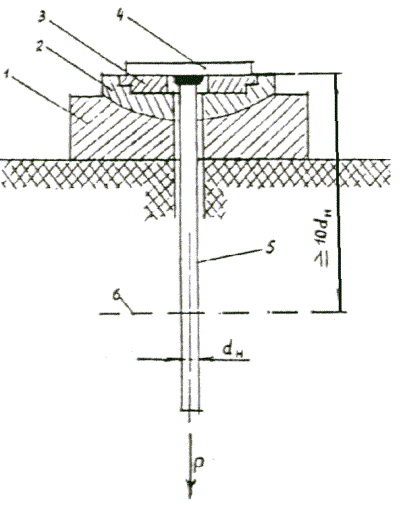 1 - сферическая опора; 2 - сферический вкладыш; 3 - сменное опорное кольцо; 4 - плоский элемент закладного изделия; 5 - анкерный стержень; 6 - граница закрепления в захвате разрывной машины; dн - номинальный диаметр анкерного стержня; Р - испытательная нагрузка