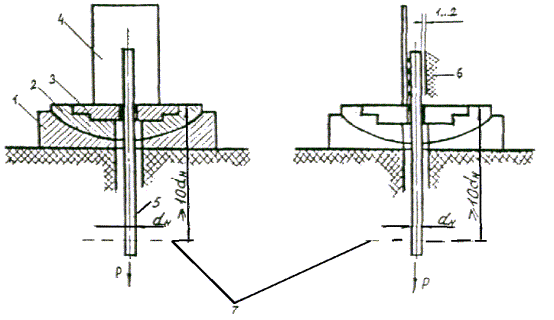 1 - сферическая опора; 2 - сферический вкладыш; 3 - сменное опорное кольцо; 4 - плоский элемент закладного изделия; 5 - анкерный стержень; 6 - упор, препятствующий изгибу образца; 7 - граница закрепления в захватах разрывной машины; dн - номинальный диаметр анкерного стержня; Р - испытательная нагрузка