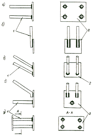 а, б, в, г - закладные изделия открытого типа (соответственно с перпендикулярным, параллельным, наклонным и смешанным расположением анкерных стержней); д - закладное изделие закрытого типа (с перпендикулярным расположением анкерных стержней); 1 - анкерные стержни; 2 - плоский элемент