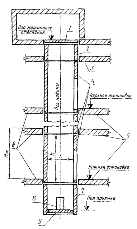 1 - плита перекрытия над шахтой лифта; 2 - верхний блок; 3 - чердачное перекрытие; 4 - средние блоки; 5 - лестничные площадки; 6 - междуэтажные перекрытия; 7 - нижний блок; 8 - тумба под буфер кабины; 9 - плита пола приямка; НЭТ - высота этажа здания